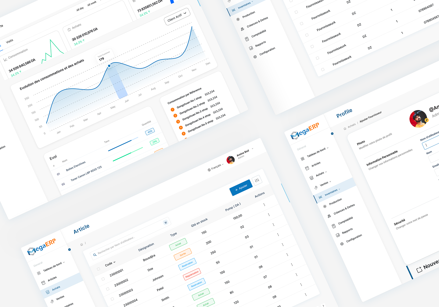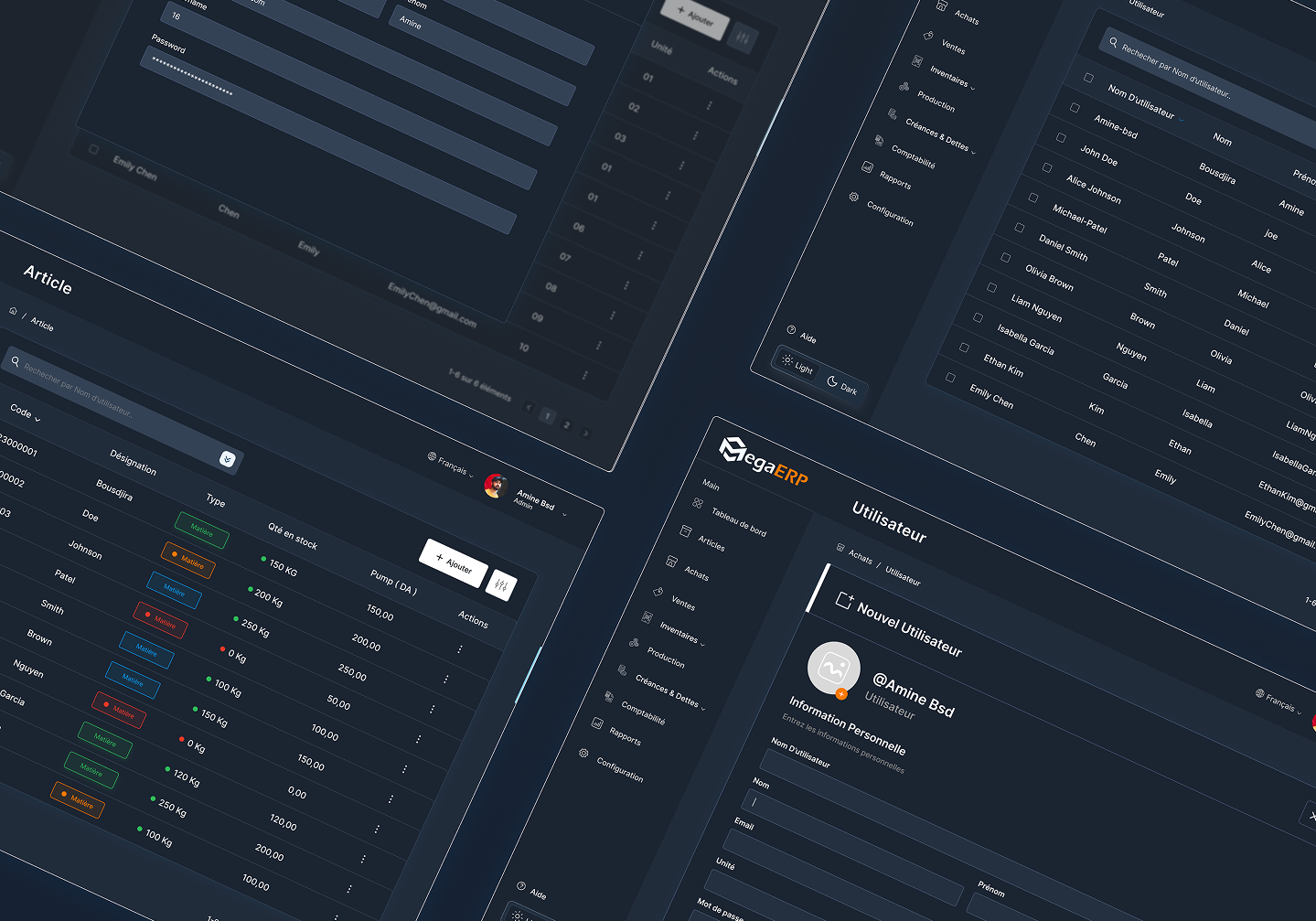 J'ai conçu from Scratch l'interface de Megasoft ERP, un logiciel de gestion multi-modules destiné aux entreprises. Le défi était de designer une expérience utilisateur intuitive et cohérente pour un outil complexe couvrant plusieurs modules — comptabilité, stocks, plus encore — tout en rendant la navigation fluide et accessible pour des utilisateurs aux profils variés. Sur Figma, j'ai élaboré une interface claire, moderne et structurée, en accordant une attention particulière à la hiérarchie de l'information, la lisibilité des données et la consistance visuelle à travers tous les modules.