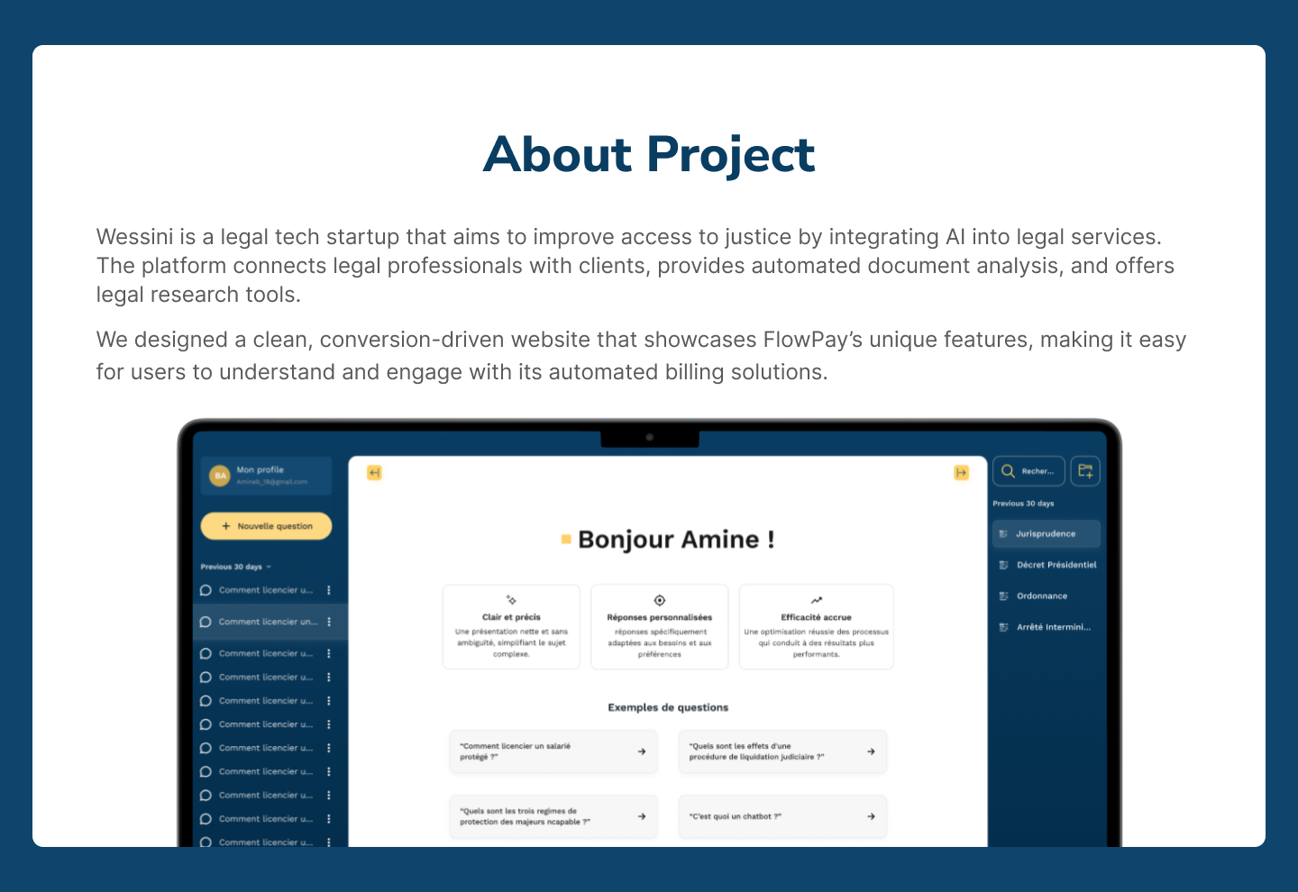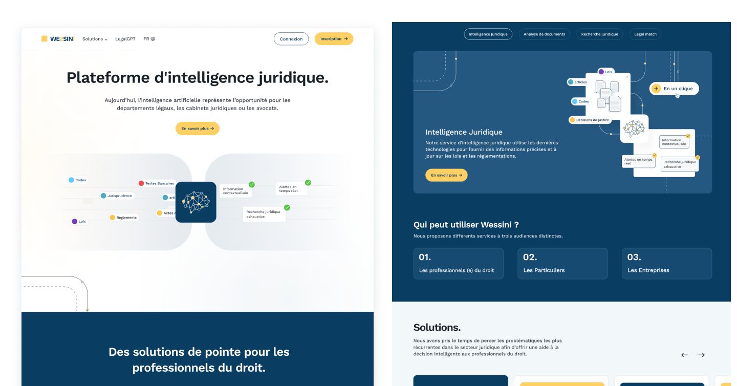 Mandaté en tant que freelance, j'ai assuré le design UI/UX complet sur Figma et le développement sur Webflow du site de Wessini, une plateforme LegalTech algérienne qui révolutionne l'accès aux services juridiques grâce à l'intelligence artificielle. Le défi était de créer de A à Z une présence en ligne forte pour le lancement d'un produit innovant — l'application Wessini Legal Pro — dans un secteur traditionnel peu habitué à la digitalisation. J'ai conçu une interface moderne et rassurante, pensée pour inspirer confiance auprès des professionnels du droit tout en communiquant clairement les bénéfices de la plateforme : conseils juridiques instantanés, rédaction de contrats simplifiée et génération rapide de documents légaux. Le résultat : un site percutant et crédible, taillé pour accompagner le lancement et la croissance de Wessini sur le marché algérien.